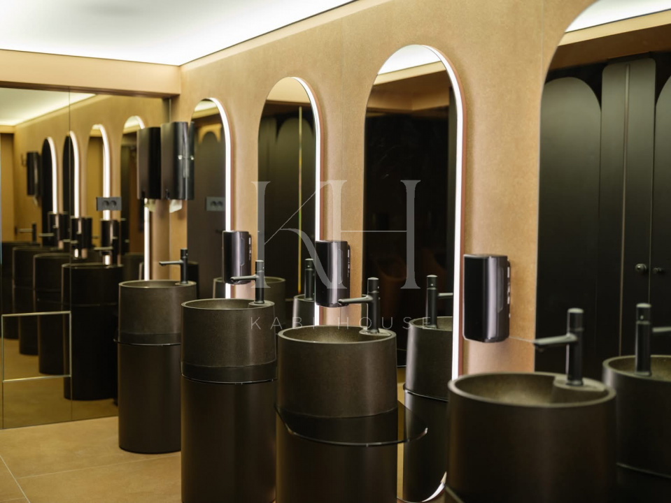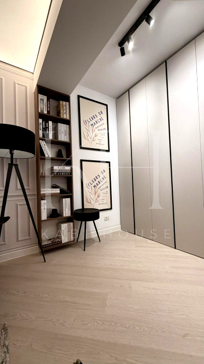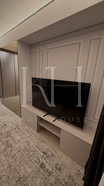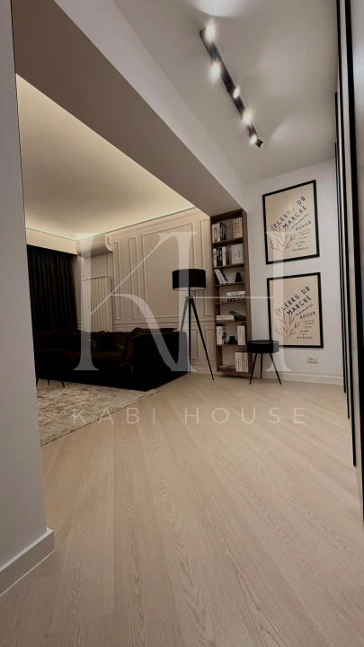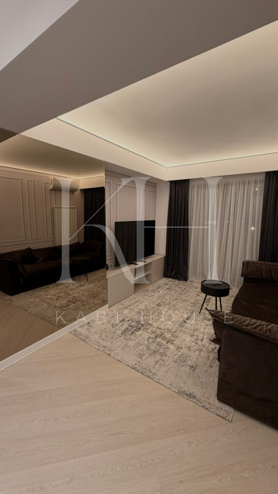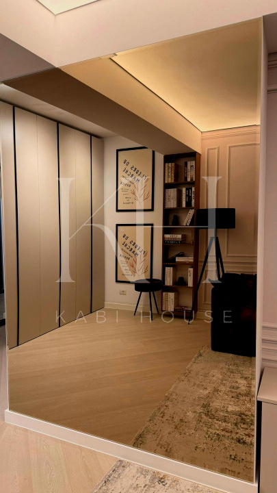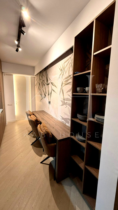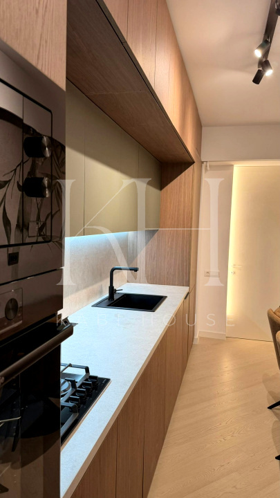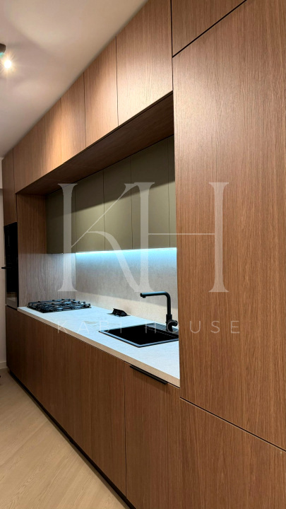 Apartament spectaculos, amenajat cu finisaje premium și accente de design contemporan, ideal pentru închiriere în segmentul high-end. Bucătăria este open space, complet utilată, cu fronturi mate în nuanțe elegante de verde salvie, blat și oglindă decorativă aurie care amplifică lumina și senzația de spațiu.